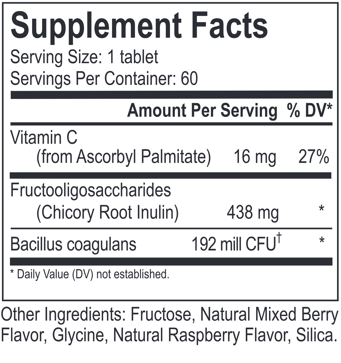 Flora Chewable contains the spore form probiotic bacillus coagulans and prebiotic fructooligosaccharides (FOS). Bacillus coagulans—a lactic acid-producing bacterial endospore nourished by the FOS.