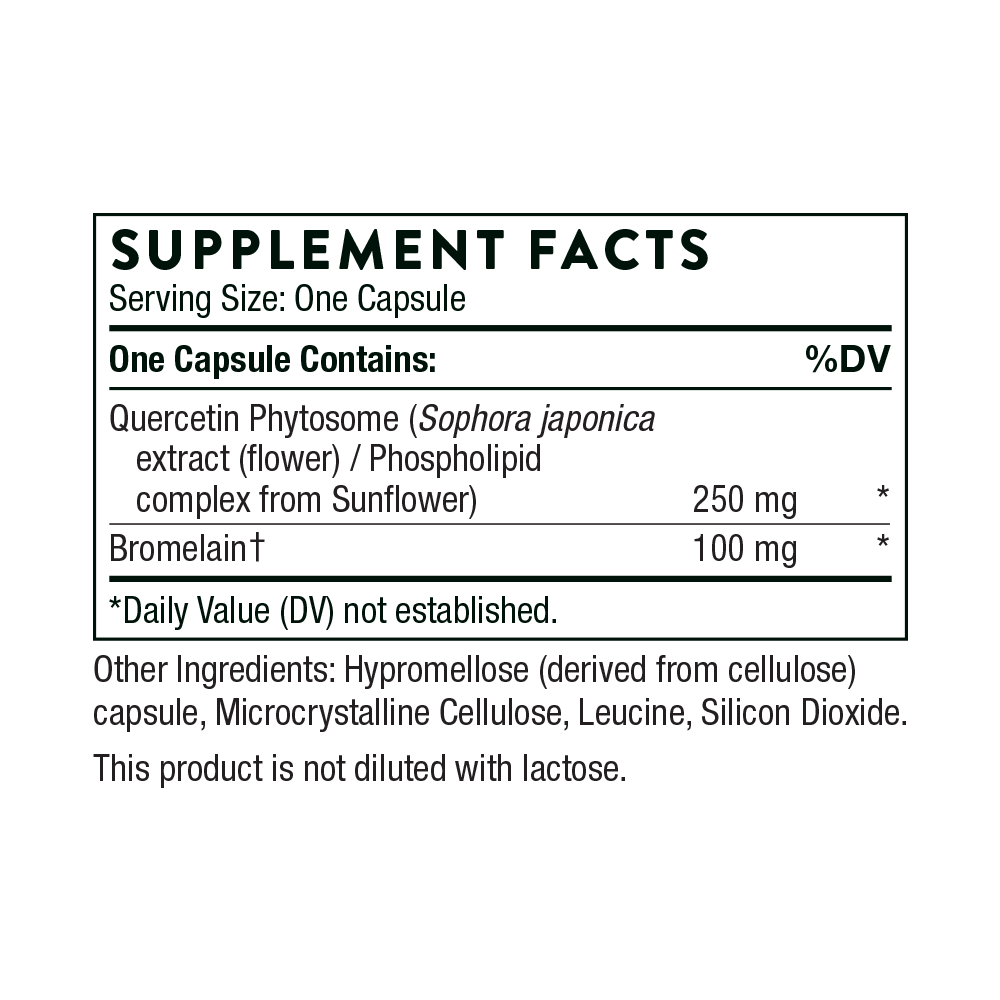 Thorne's Quercenase combines quercetin phytosome (quercetin bound to sunflower-sourced phospholipids, which increases the body's ability to absorb the quercetin) and bromelain, a compound of protein-digesting enzymes derived from the pineapple plant.*