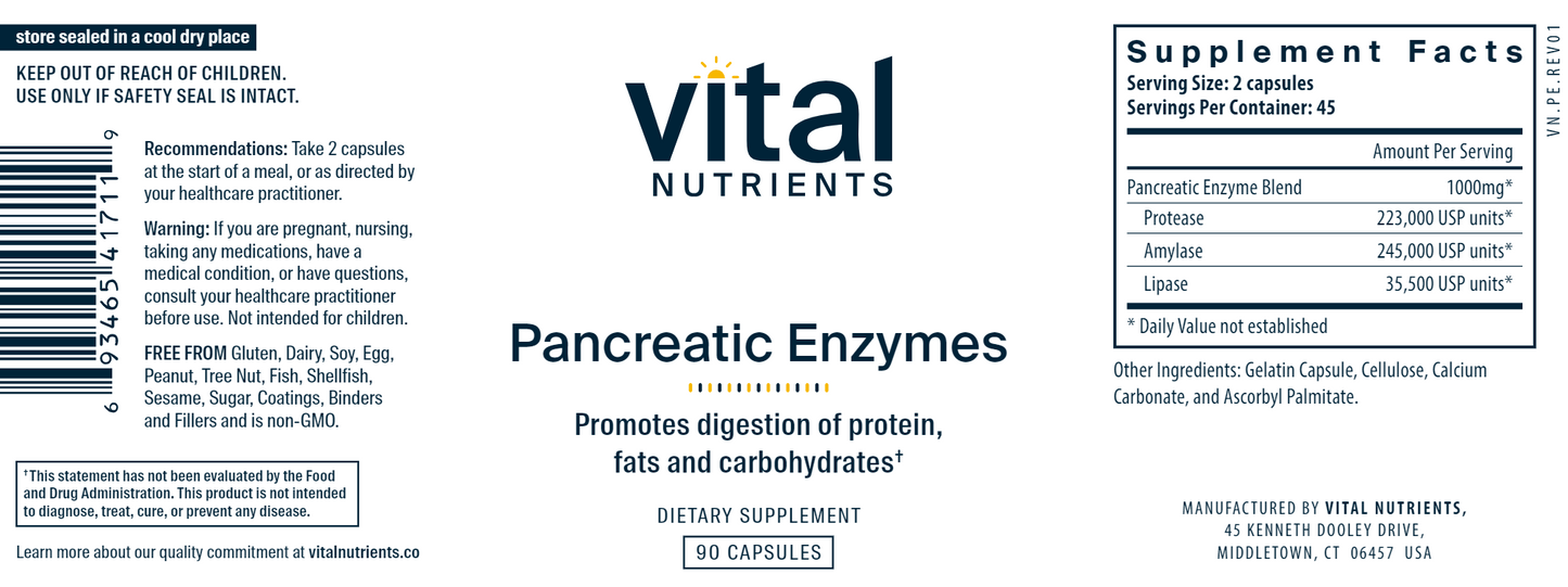 Pancreatic Enzymes support healthy digestion by supplying natural enzymes that are secreted by the pancreas.* These pancreatic enzymes are essential to the breakdown and absorption of food and its nutrients, helping to promote the normal digestion of proteins, fats and carbohydrates.*
